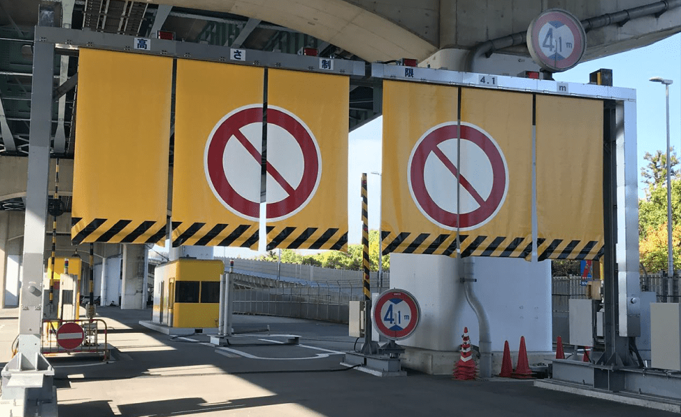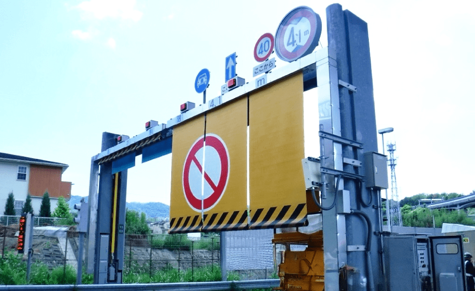 本装置は、門構上部から「通行止」標識が描かれた幕を降下させることで、ドライバーに対して安全かつ迅速に通行止めを通知するものです。